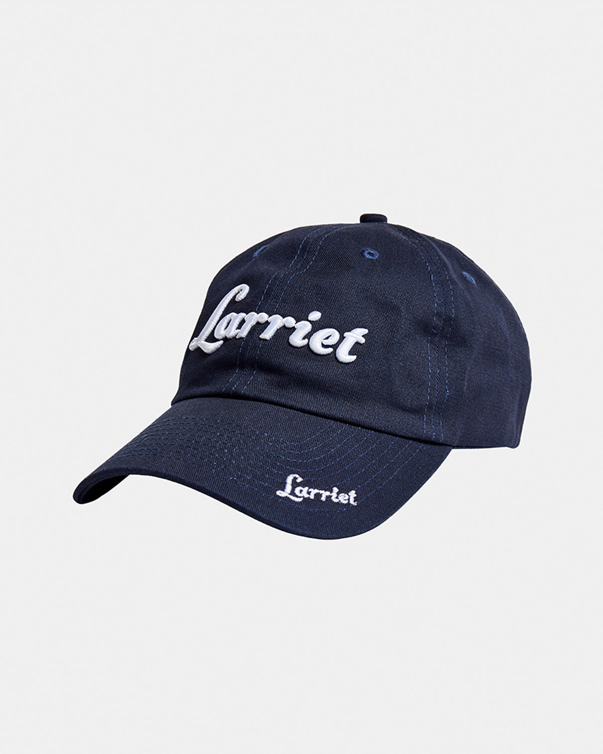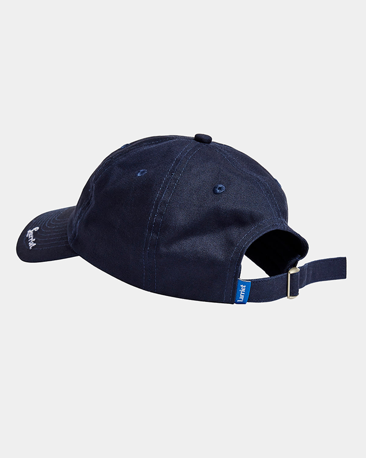 The Belmond Cap is made from 100% cotton twill and features raised emboirdery artwork on the front of the crown and top of peak. . It has a six-panel construction with a shallow fit, a slightly curved brim, and a strap-back closure with a metal clasp and a Larriet woven label.