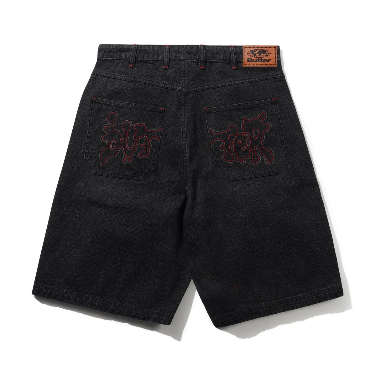 100% Cotton Baggy Fit Denim Shorts, Rivets On Front Pockets, Patch Pockets On Back With Chain Stitch Embroidery, PU Patch On Waist Band, Belt Loops With Internal Drawstring On Waist Band, Blind Side Seams.