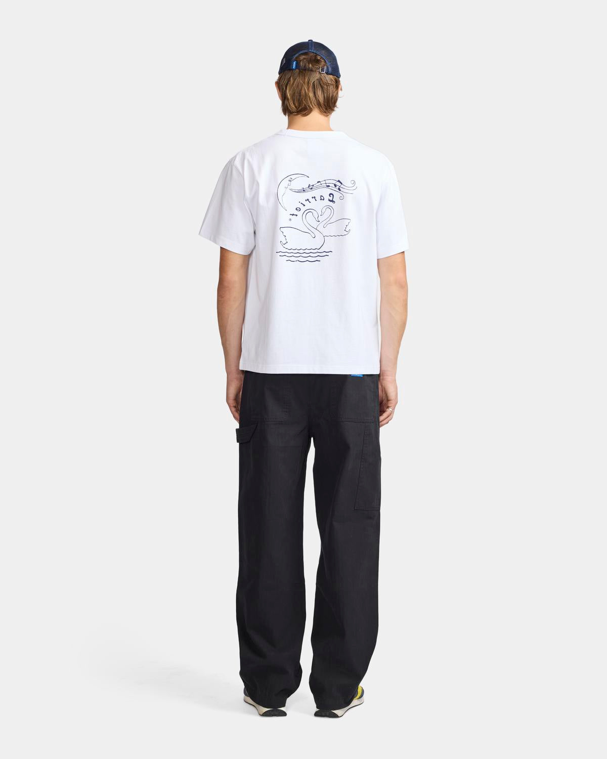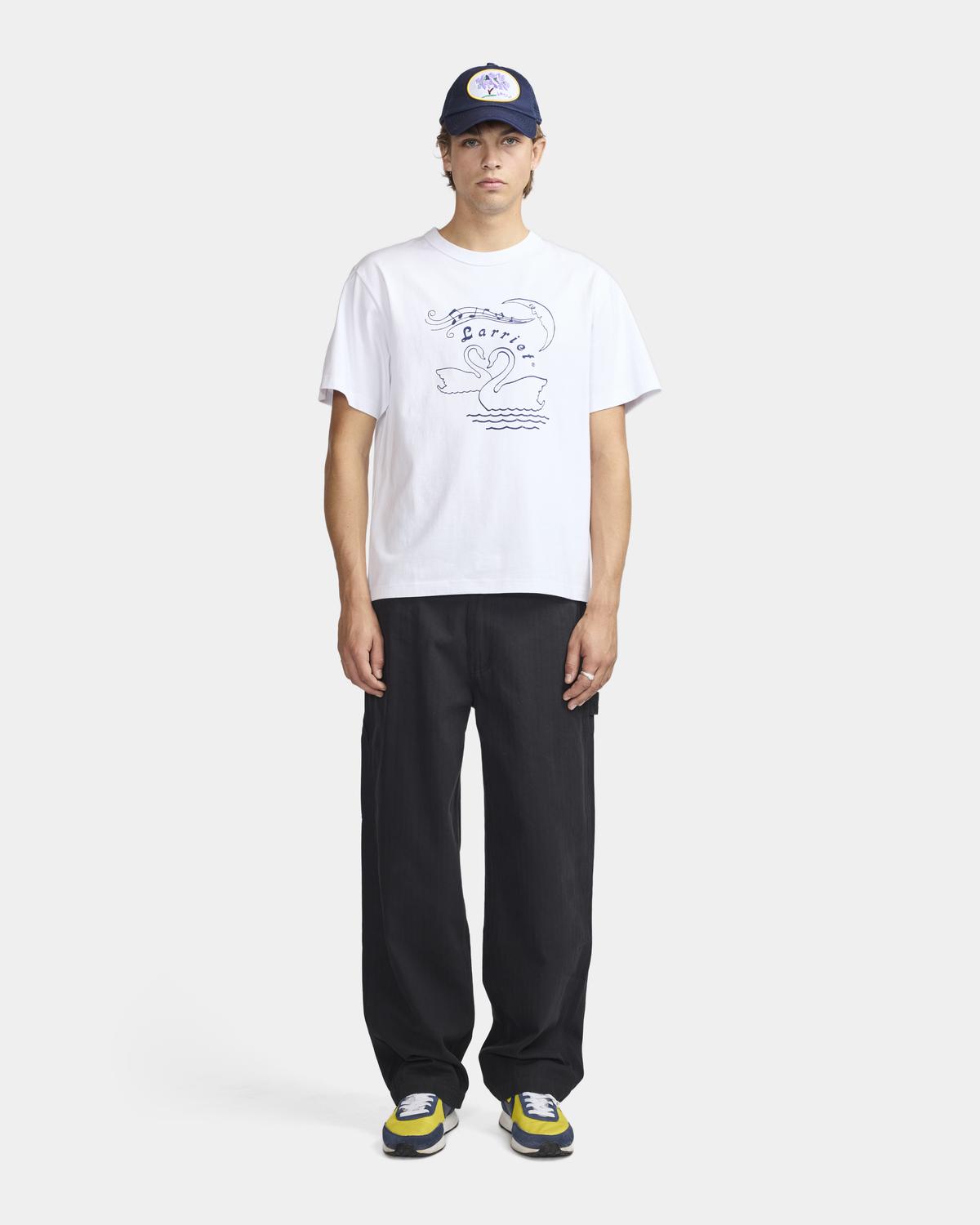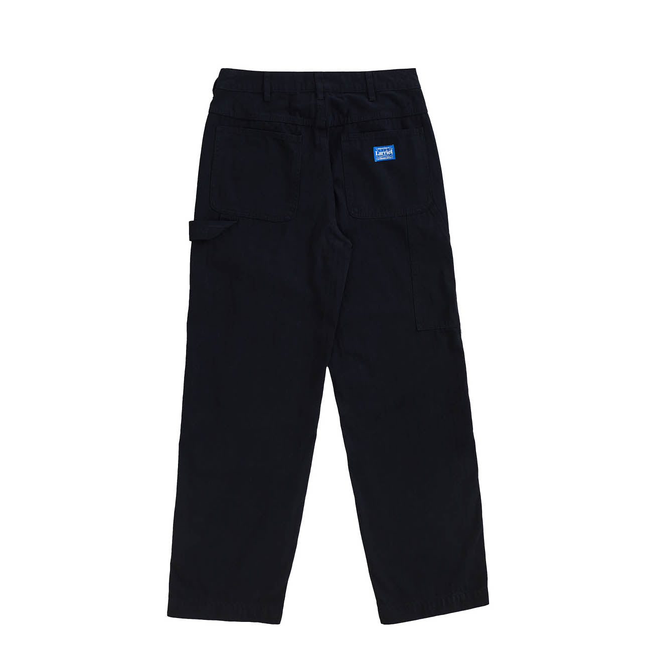 The Carpenter Pant is a relaxed fit pant constructed from 100% cotton herringbone. Made with robust workwear qualities, it features a reinforced waistband and triple stitched leg seams for durability. The pants are designed with a zip fly, front rounded pockets, a coin pocket, and two back patch pockets. It also features a hammer loop, utility pocket, and the Larriet Sun woven label. Male model is 6'2" tall with a 32" waist and wears a size 32.