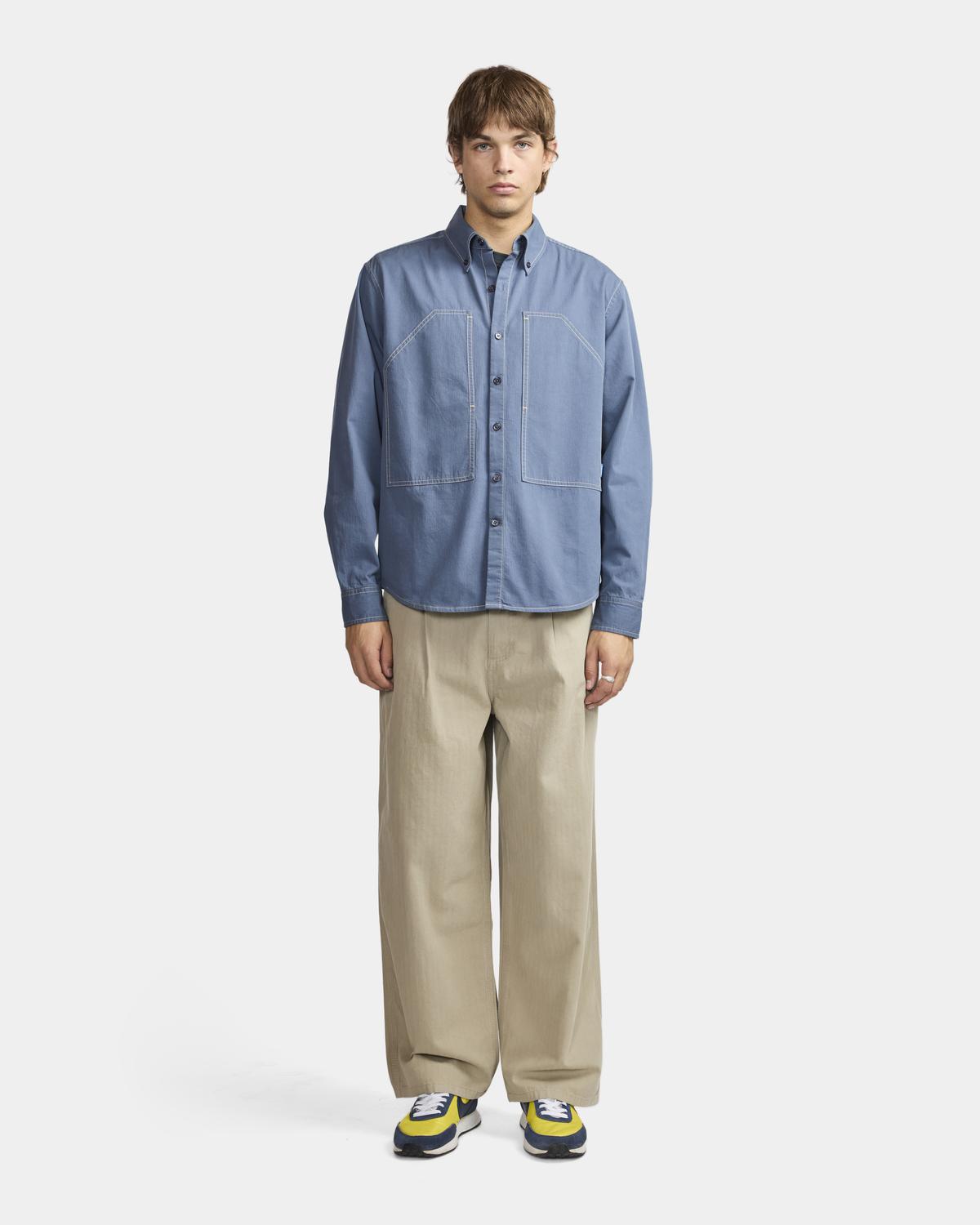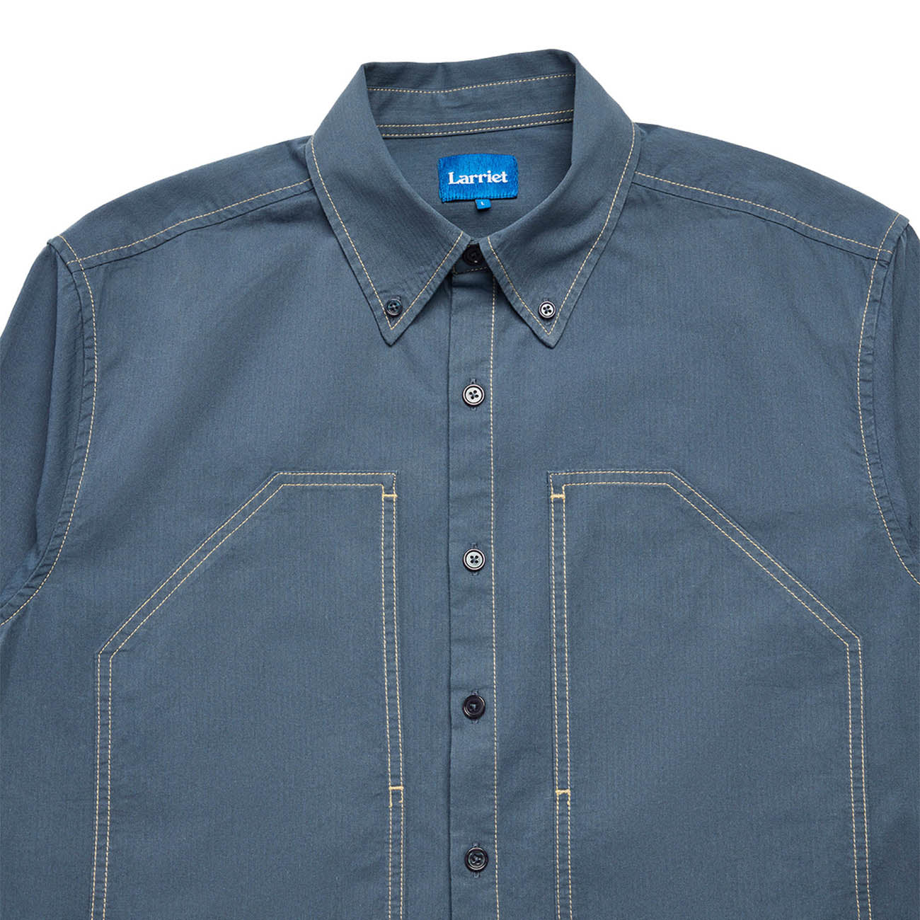 The Gully Long Sleeve Shirt is a standard-fit, long-sleeve shirt featuring a traditional button-down collar with a stand. It is made from a 100% cotton and features angled ammo-style pockets, Larriet woven label, and tonal buttons. Male model is 6'2" tall with a 32" waist and wears a size L.