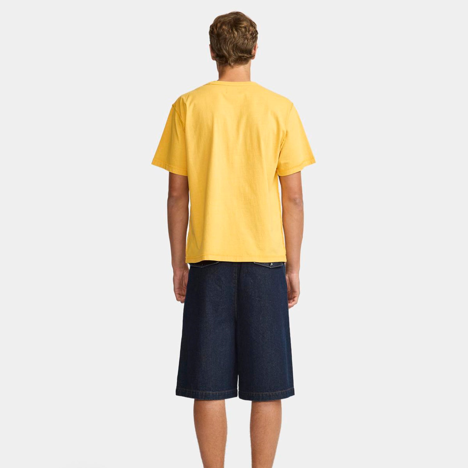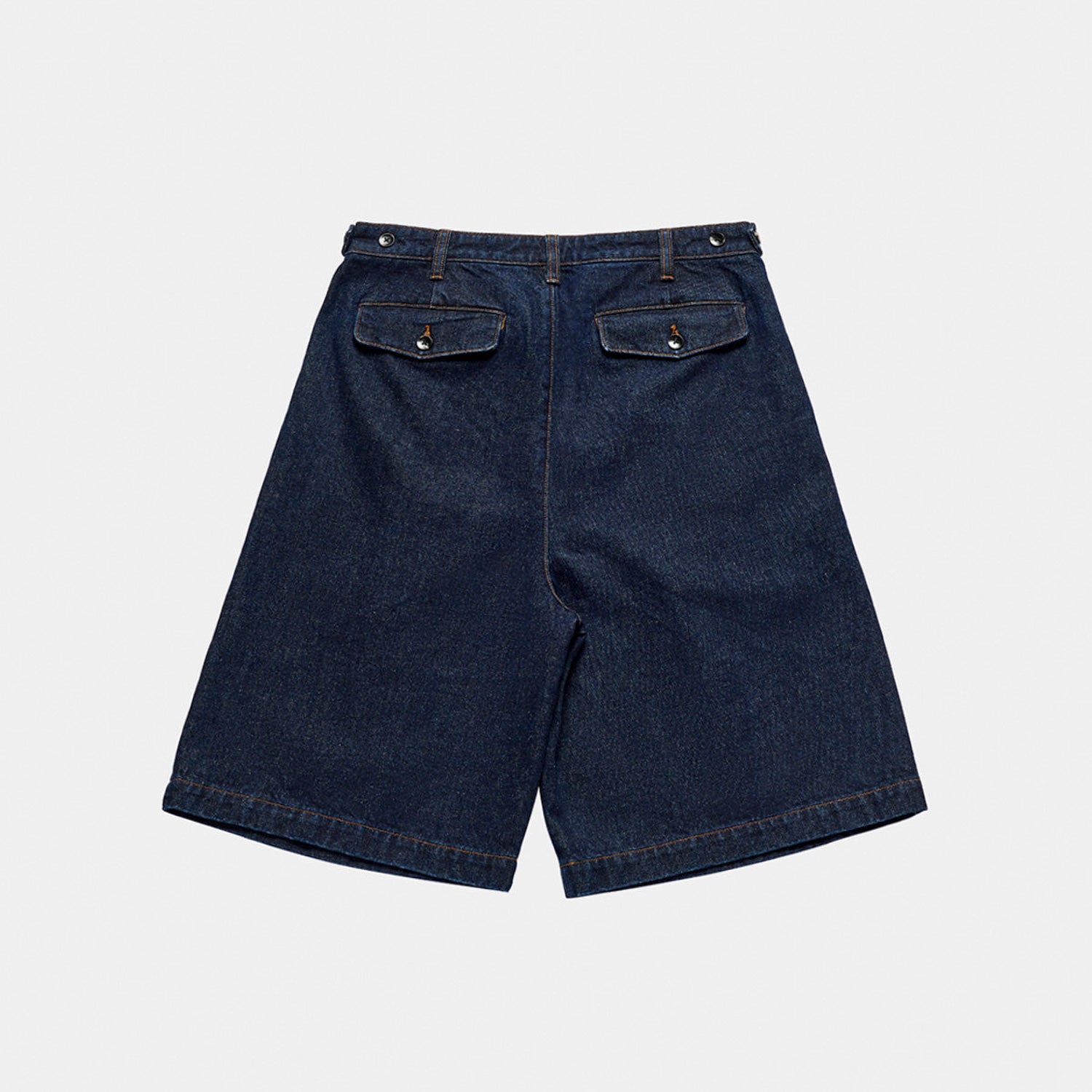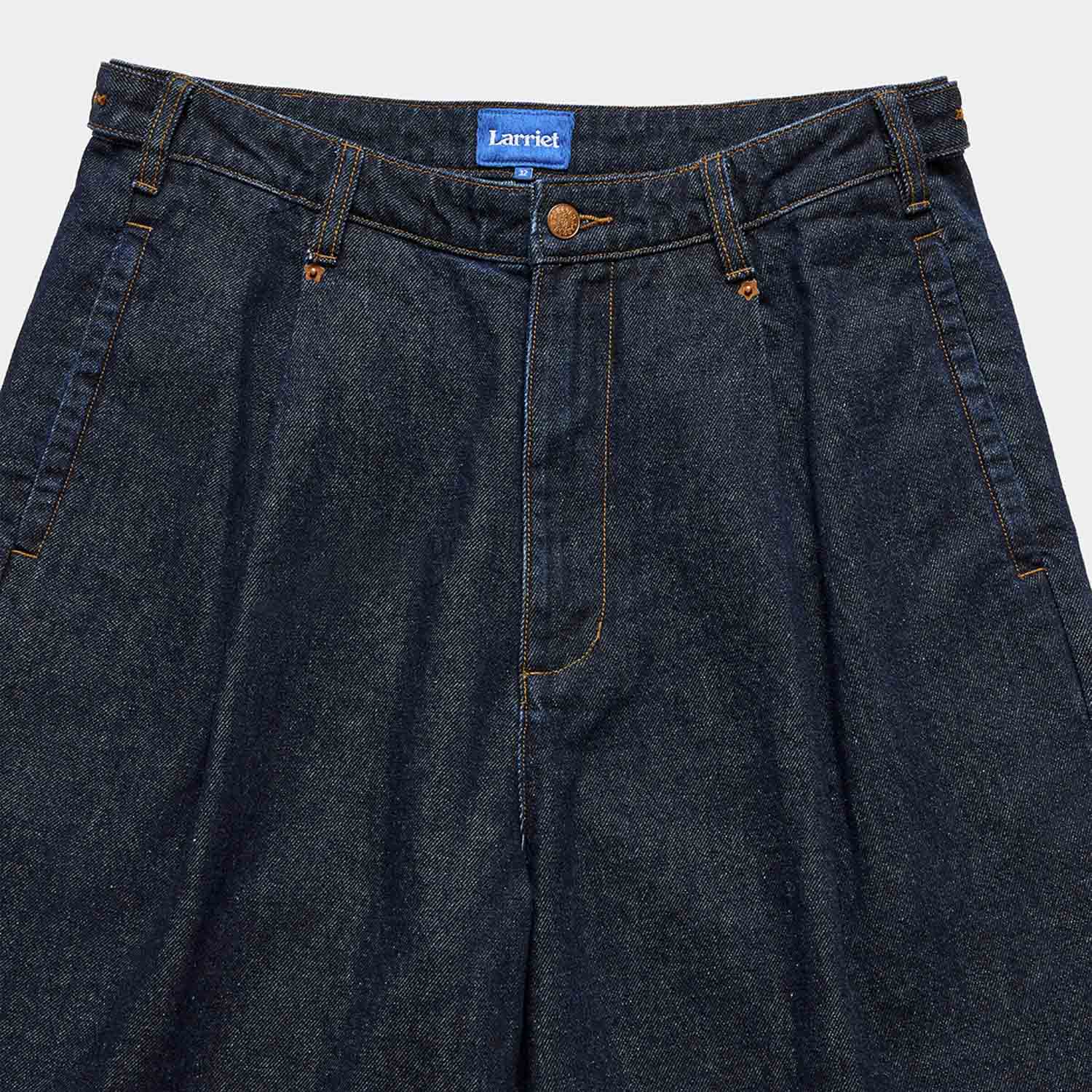 The Lyu Short is crafted from 100% cotton indigo denim with contrast tobacco stitching, offering a long and wide leg cut with deep pleats for a fuller fit. It features practical side seam pockets and back flap pockets secured with button closures. The adjustable waistband tabs ensure a perfect fit. The design includes star rivets, tortoise shell buttons, and a Larriet woven label. Male model is 6'2" tall with a 30" waist and wears a size 32.