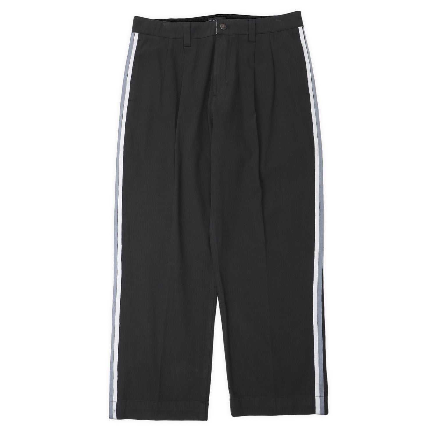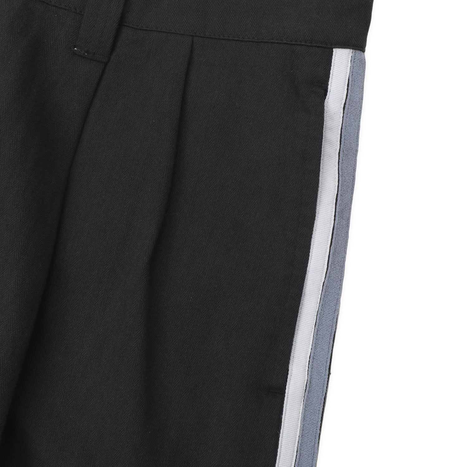 Pass~Port Leagues Club striped pant in vintage black in from range #46. The Leagues club trouser is made from 100% garment dyed cotton herringbone and features double pleats and custom button. The striped trouser introduces a new detail with contrast woven stripe down each side.